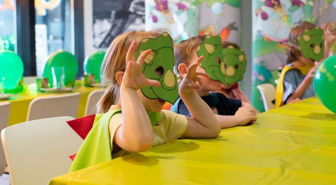 Pronti a esplorare il mondo dei giganti preistorici! Il festeggiato e i suoi ospiti indossano i loro costumi da dinosauro e tornano indietro nel tempo fino all’era dei dinosauri. Insieme, cercheranno il misterioso uovo di dinosauro, parteciperanno a una gara di velociraptor e vivranno incredibili avventure.